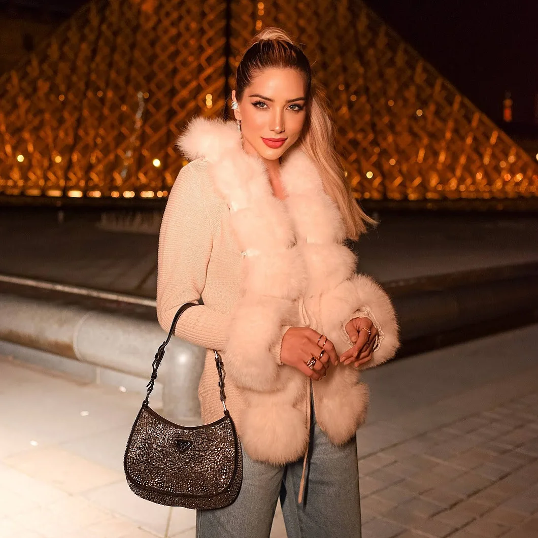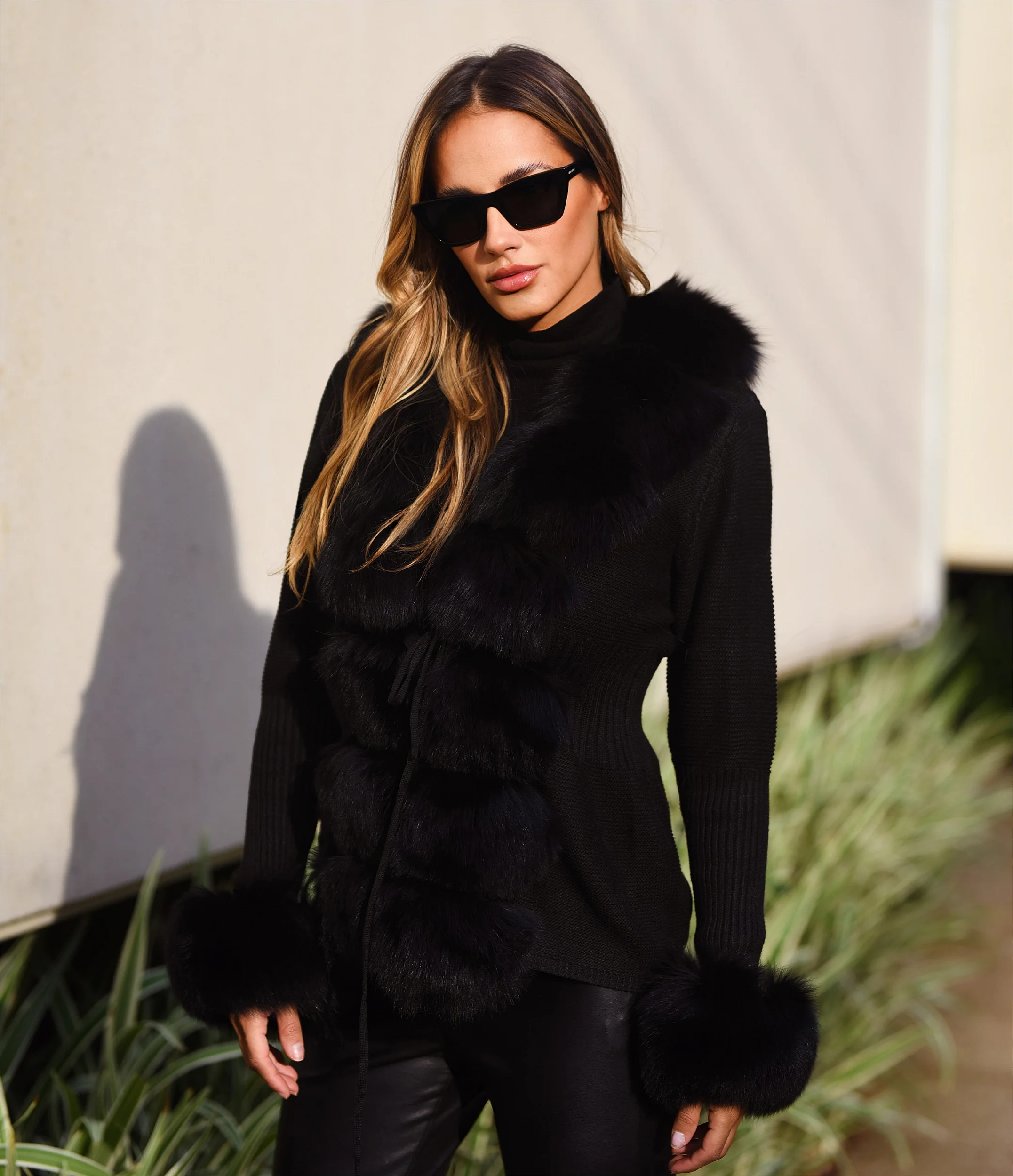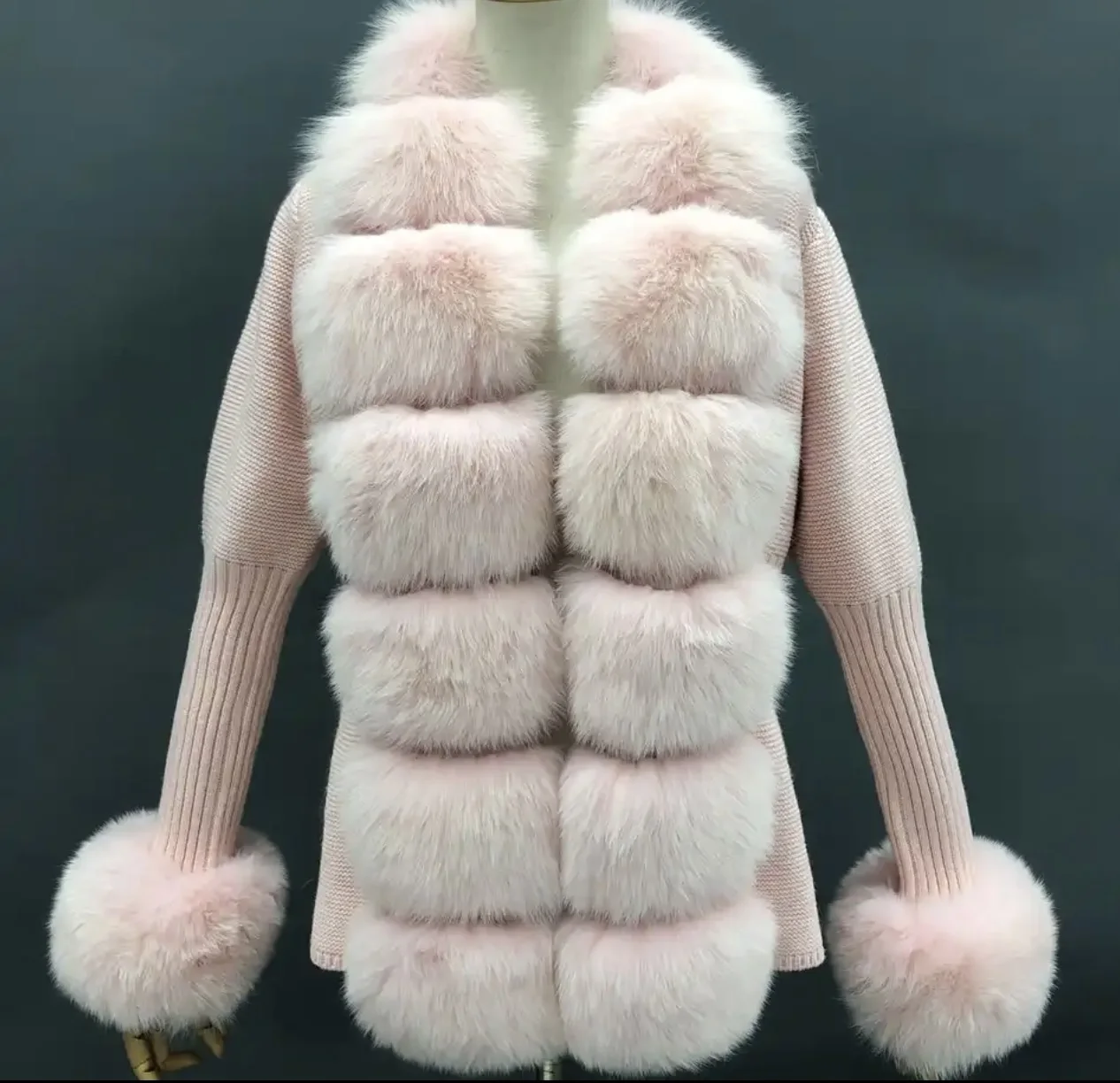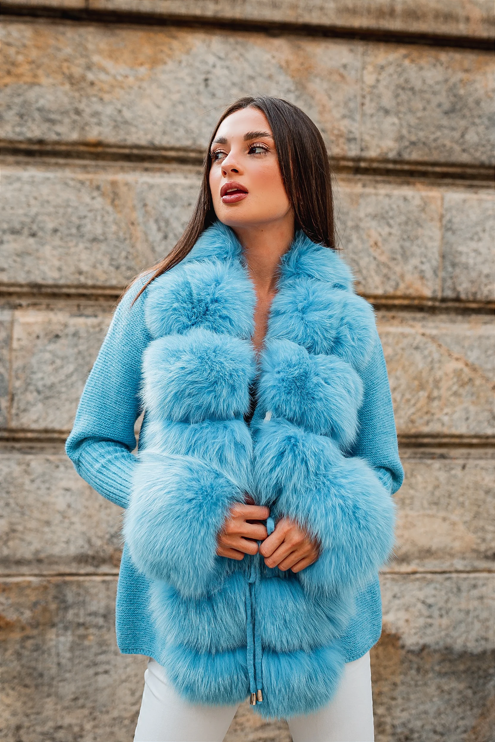 O cardigan de tricô de lã e pele natural é um luxo da moda que une a suavidade da lã com a da pele de raposa, criando uma peça de vestuário sofisticada e elegante. Os detalhes em pele de raposa, cuidadosamente incorporados no design, são removiveis, proporcionando versatilidade ao look.