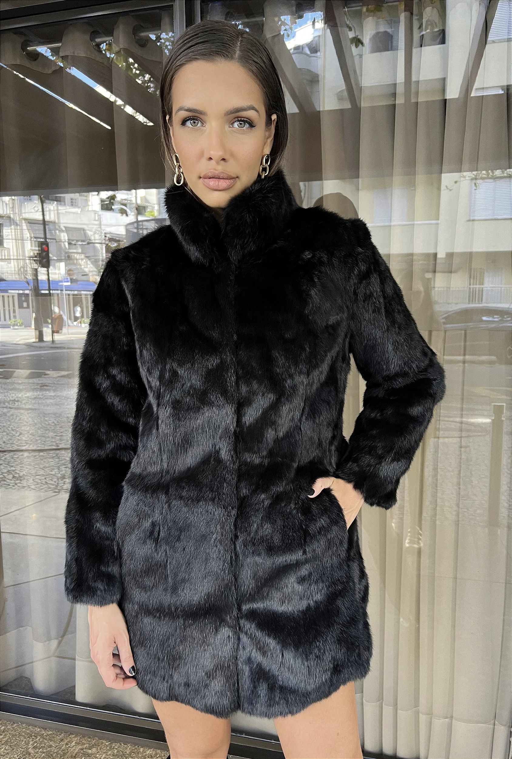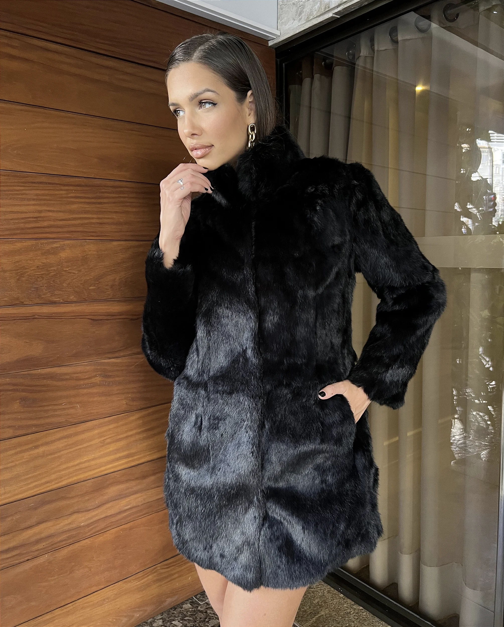 Casaco Mescla é feito de pele natural de coelho. A sofisticação da pele preta com o comprimento mais alongado criando um visual exclusivo e atemporal.