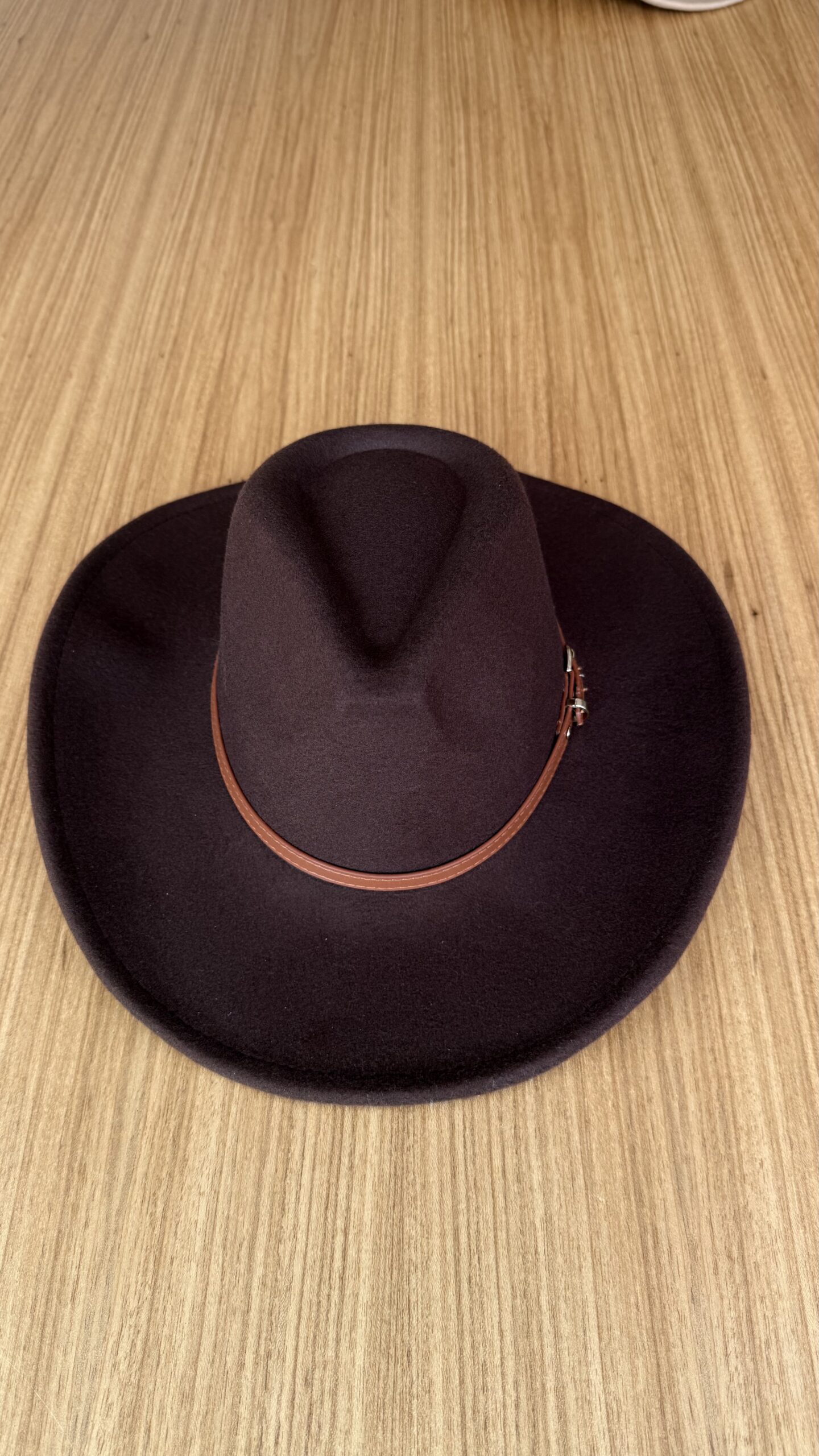 Chapéu confeccionado em feltro de alta qualidade, com design clássico e estruturado. Possui aba média levemente curva e copa com vinco central, garantindo um visual elegante e versátil. O detalhe da faixa em couro marrom com fivela metálica adiciona charme e personalidade à peça.