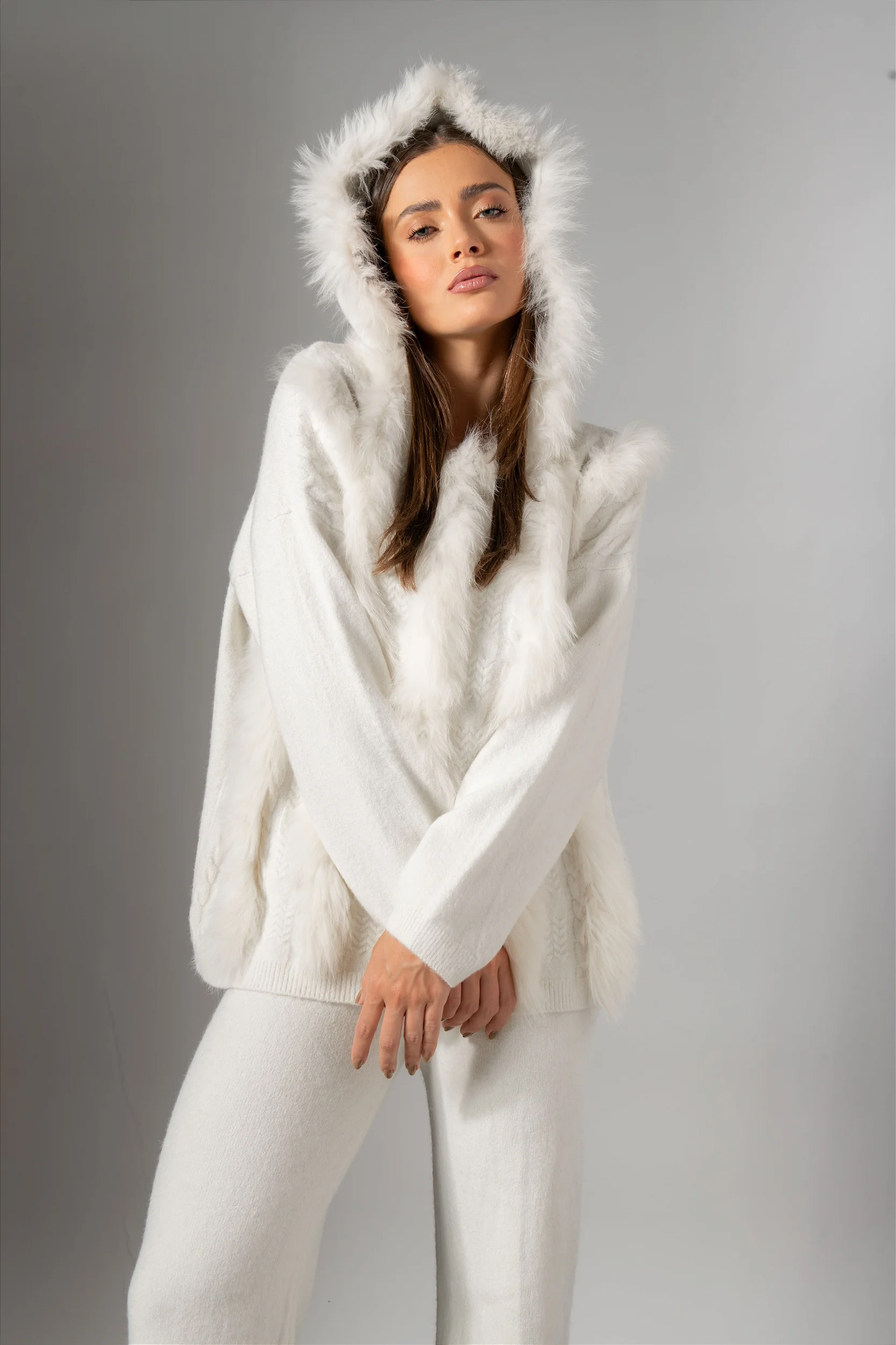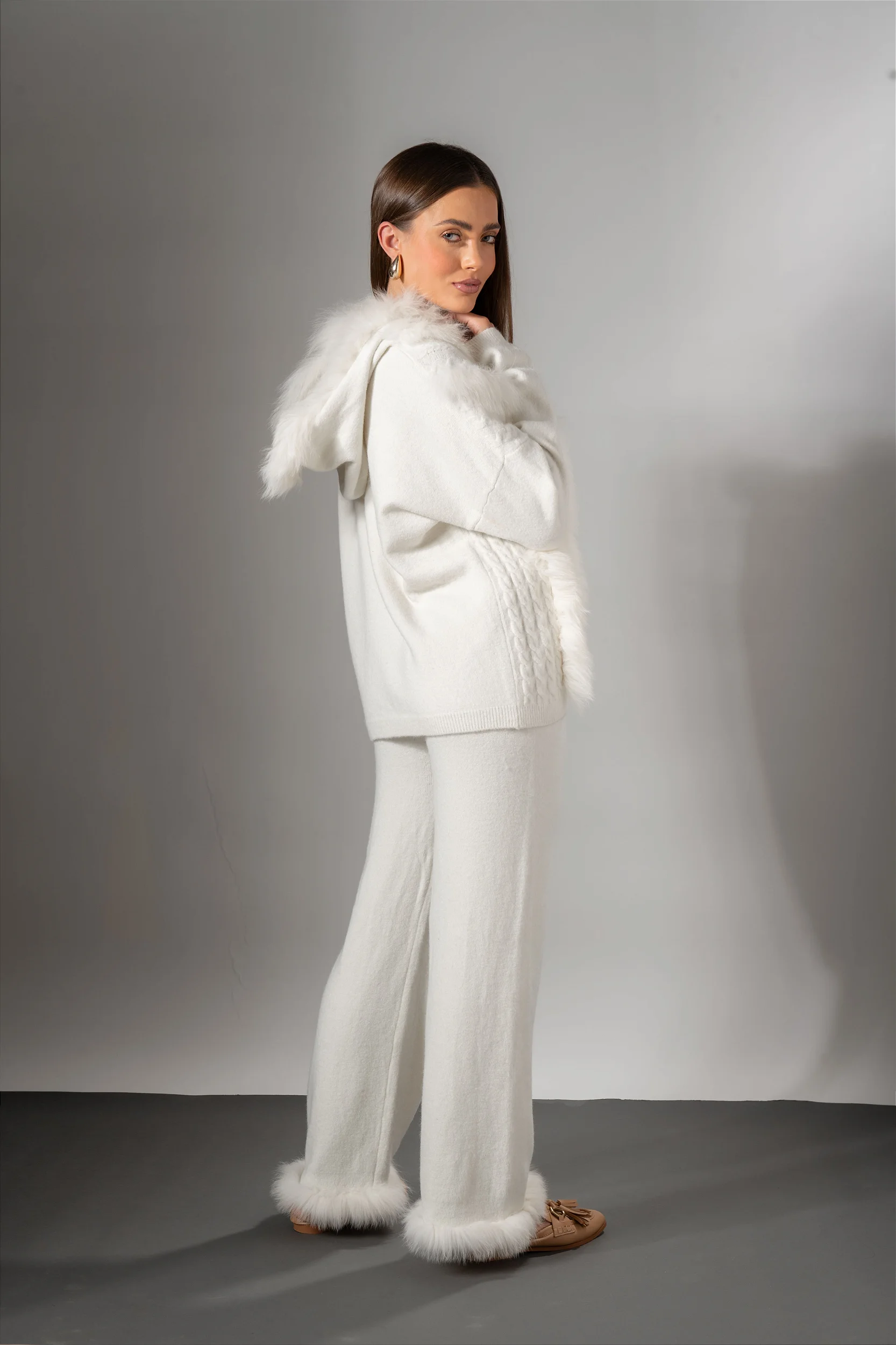 O Conjunto Comfy é confeccionado em 100% lã super macia com pele natural. Garantindo conforto, estilo e sofisticação.