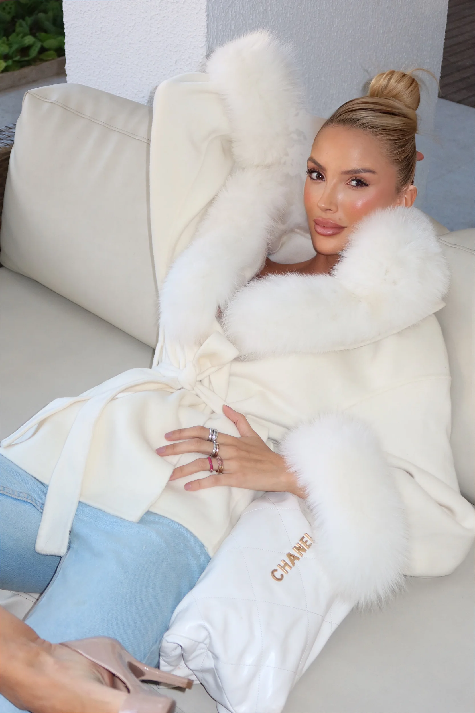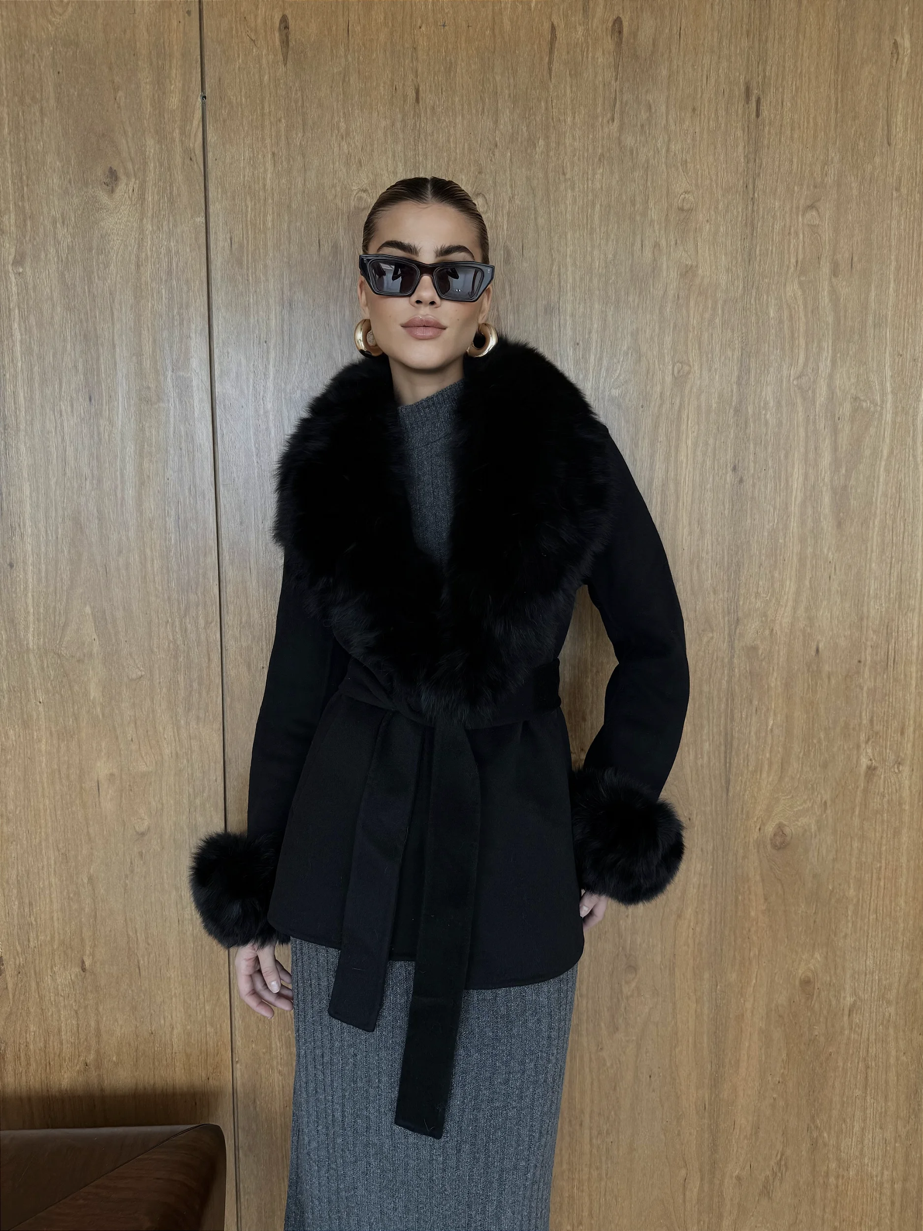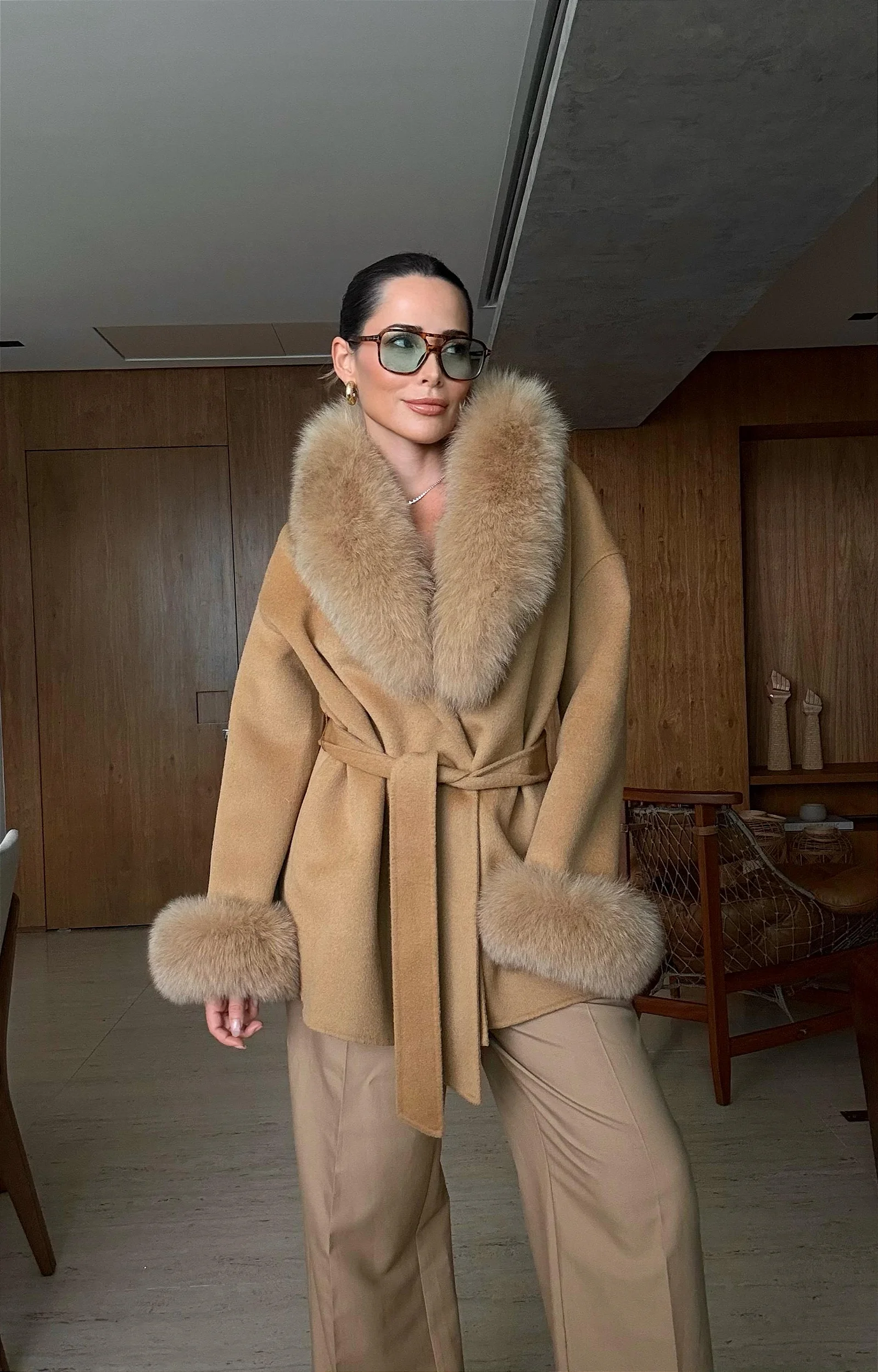 O sobretudo curto é confeccionado com o melhor e mais quente cashmere. Possui uma gola de pele de raposa densa, destacável e combinando com punhos de pele.