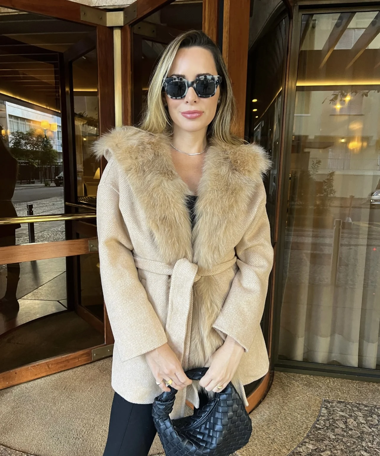 O Sobretudo Ushuaia é confeccionado com lã de alta qualidade escolhida pela sua maciez e conforto somando com a pele de raposa. O sobretudo possui um colete interno todo em pele proporcionando conforto e beleza, podendo ser usado de diversas formas. Sua textura suave e estrutura sofisticada fazem dele a peça perfeita para qualquer guarda-roupa. Peça extremamnte quente.