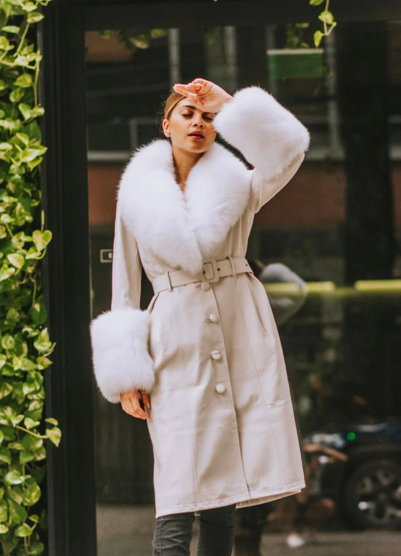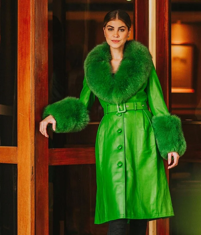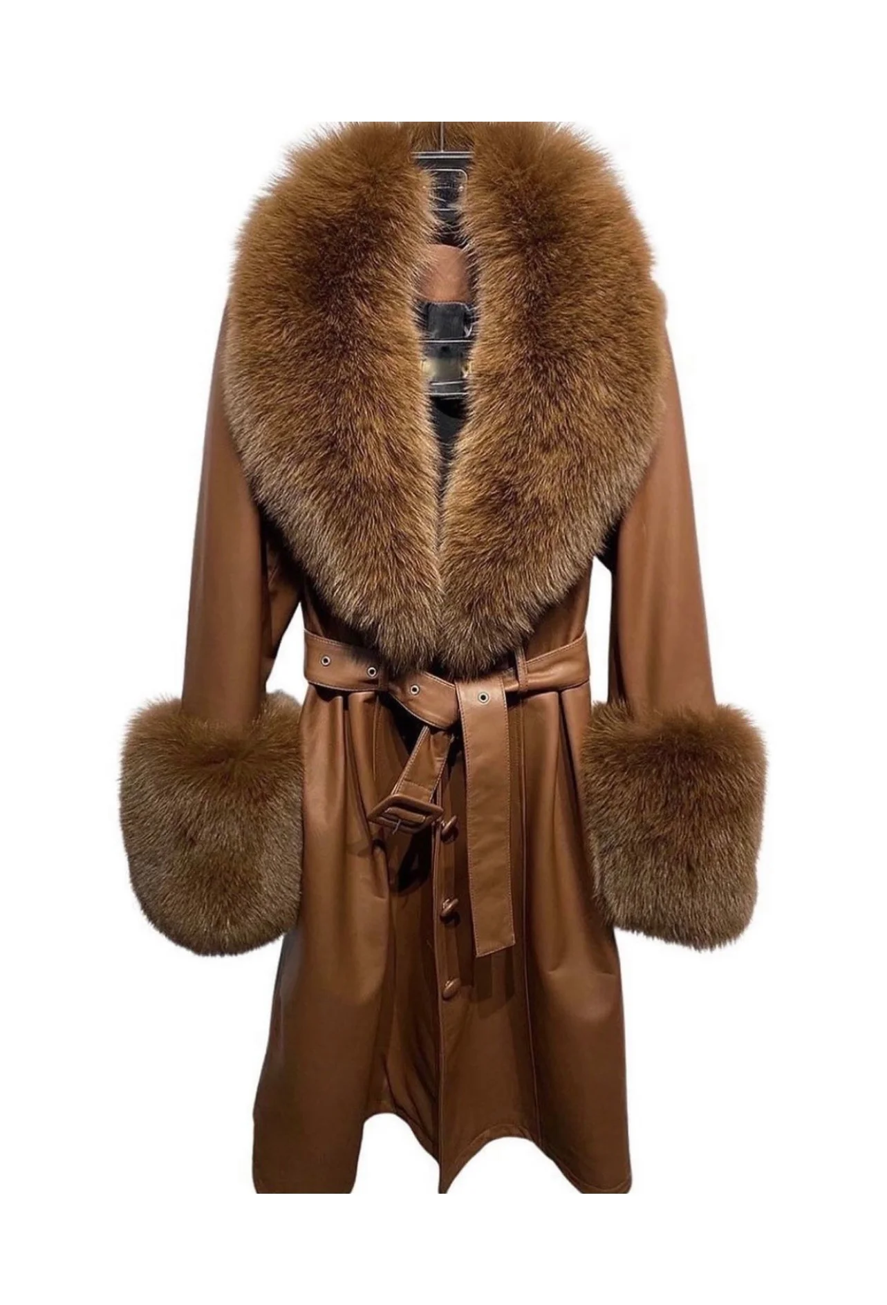 Abuse dessa peça que cria um visual luxuoso e impactante. Na mistura do couro com pele de raposa, se torna a peça sofisticada e eterna para ter em seu closet. Versátil pois tem a pele da gola e punhos removíveis.