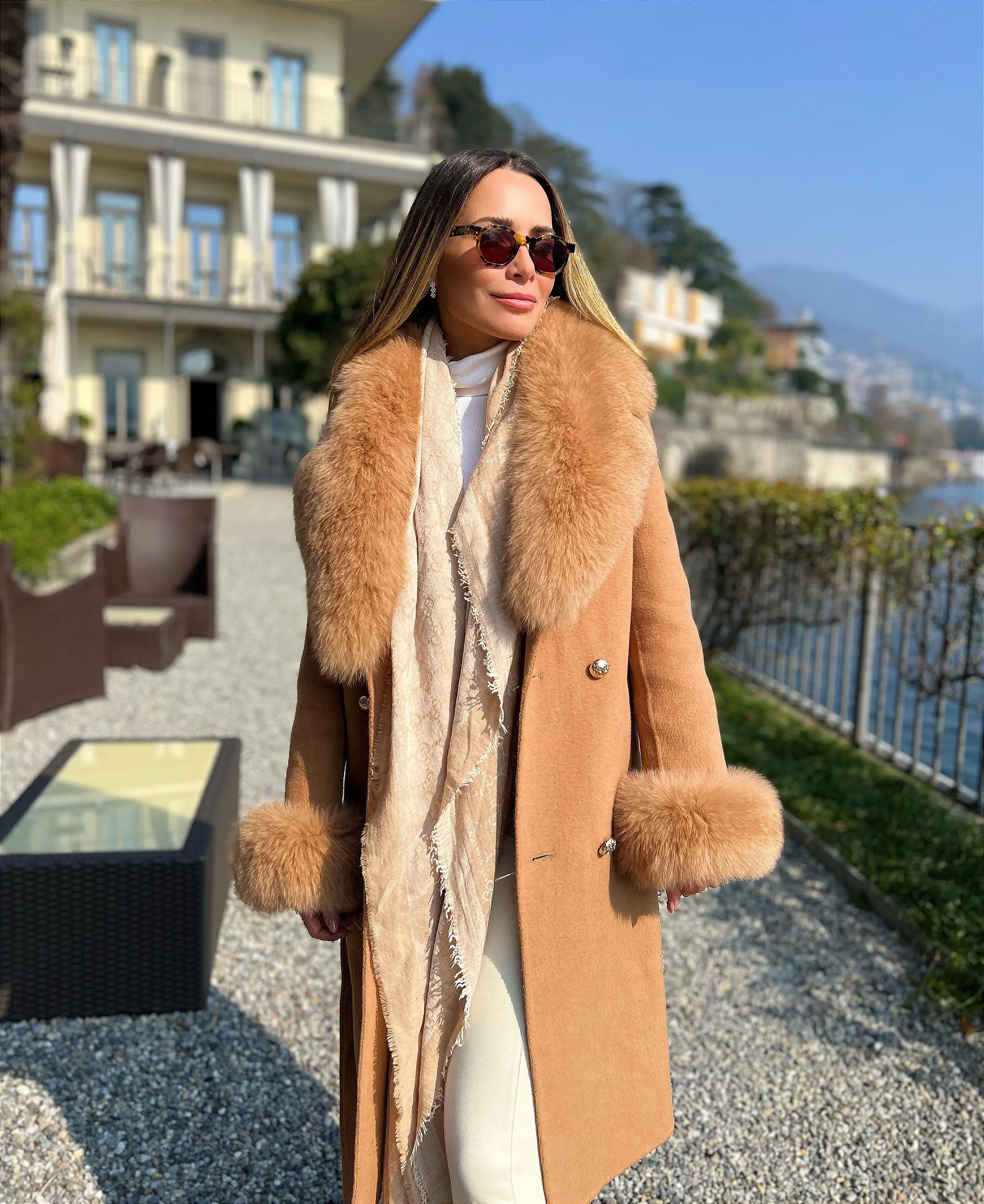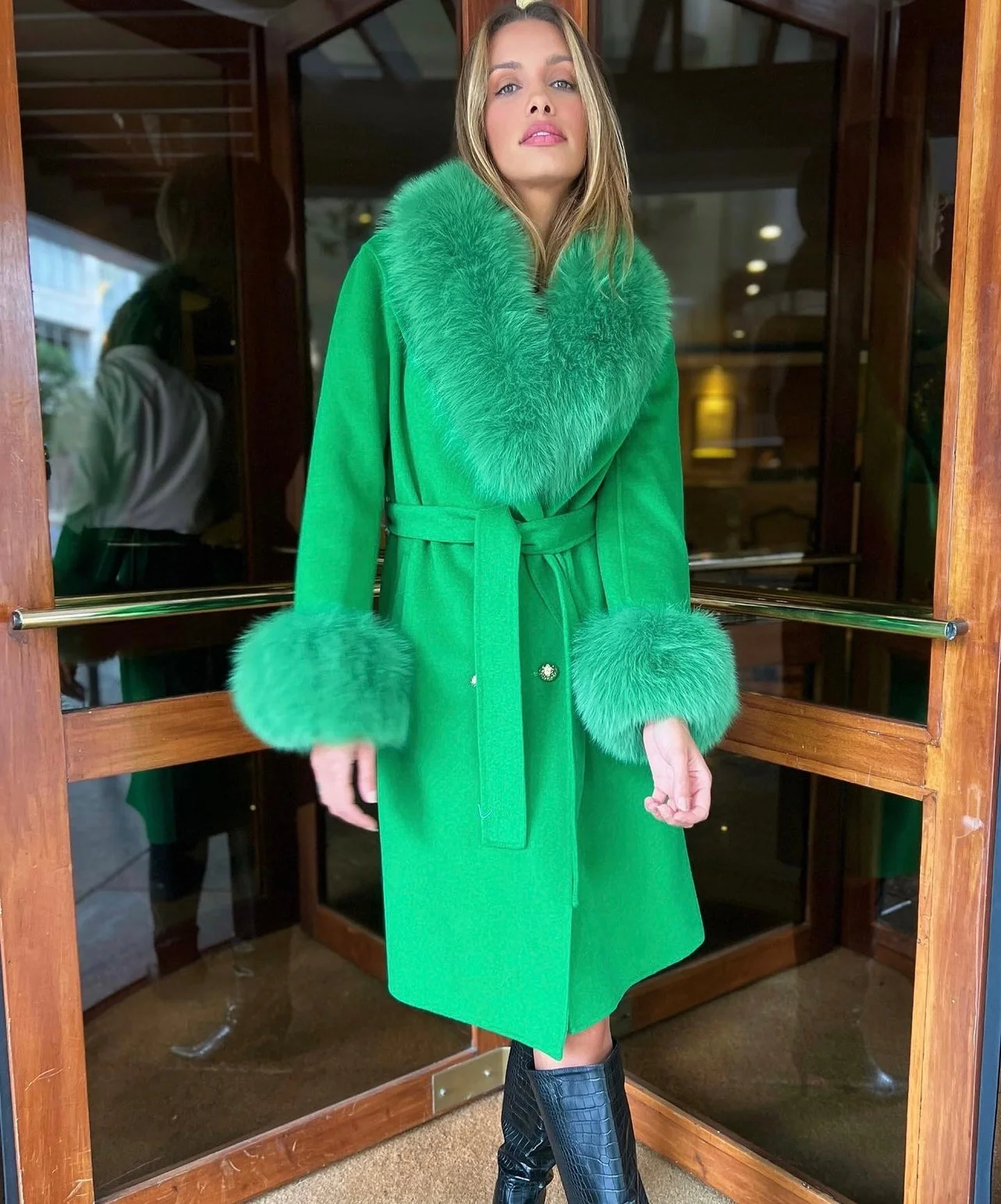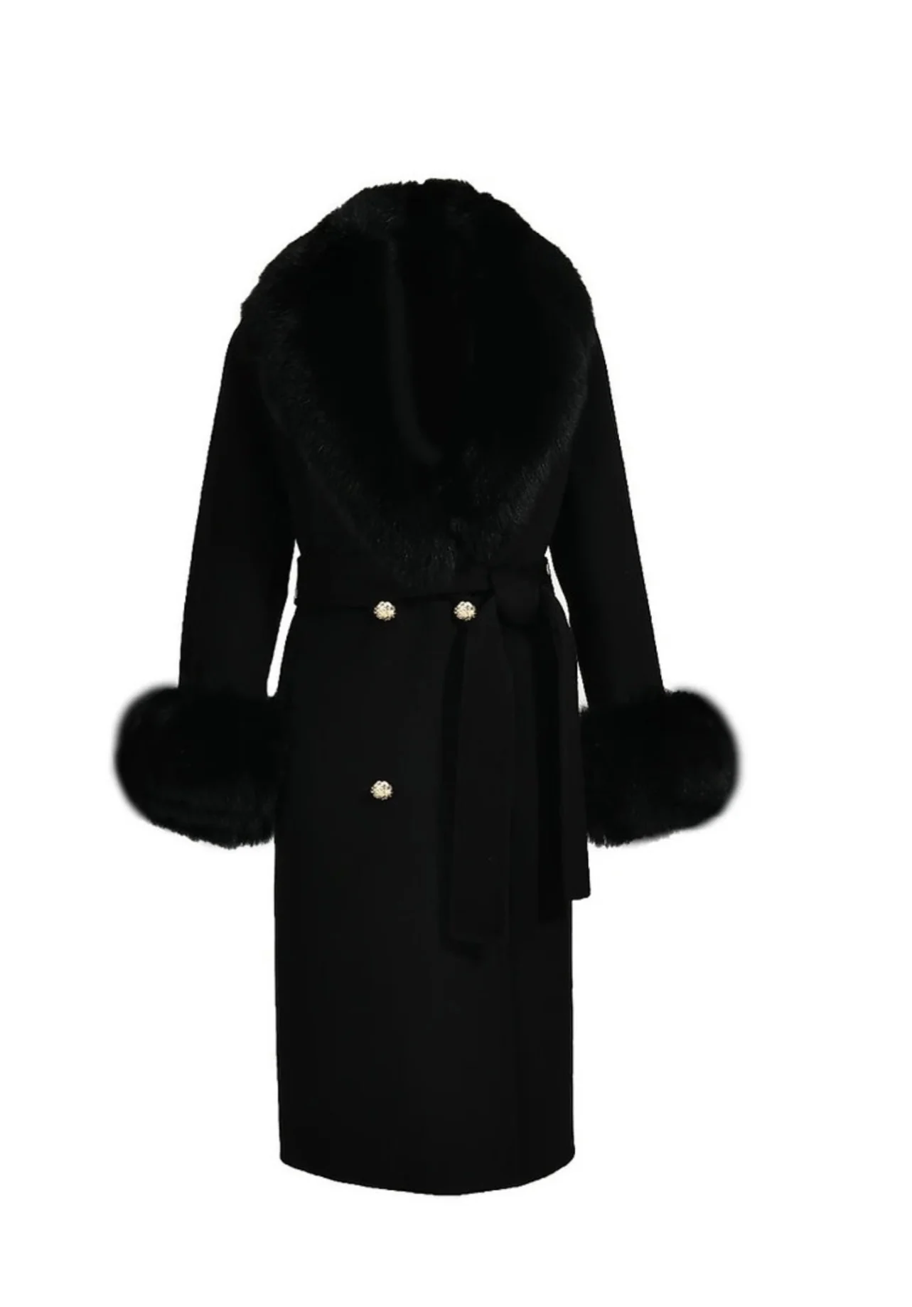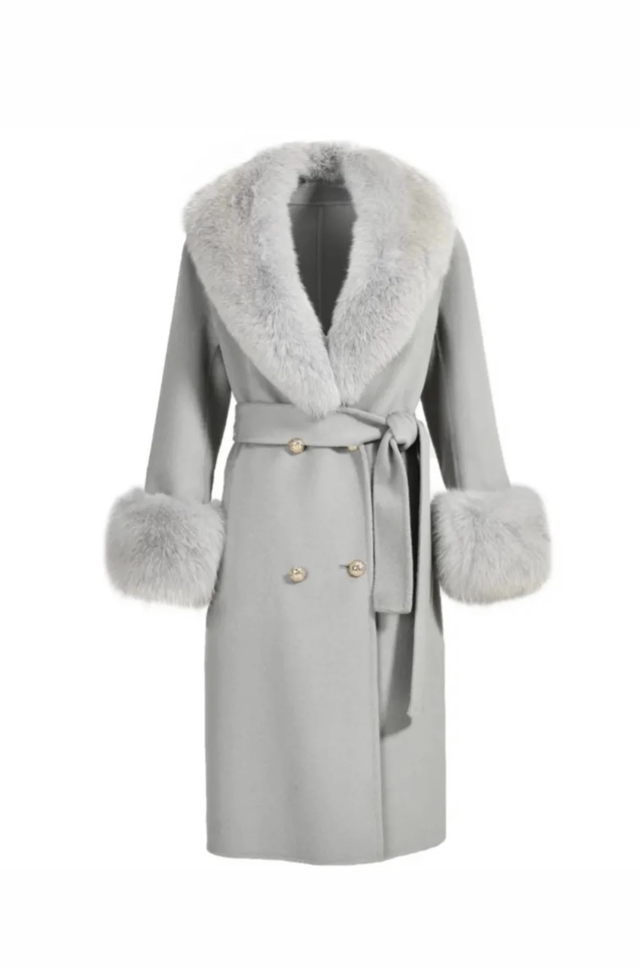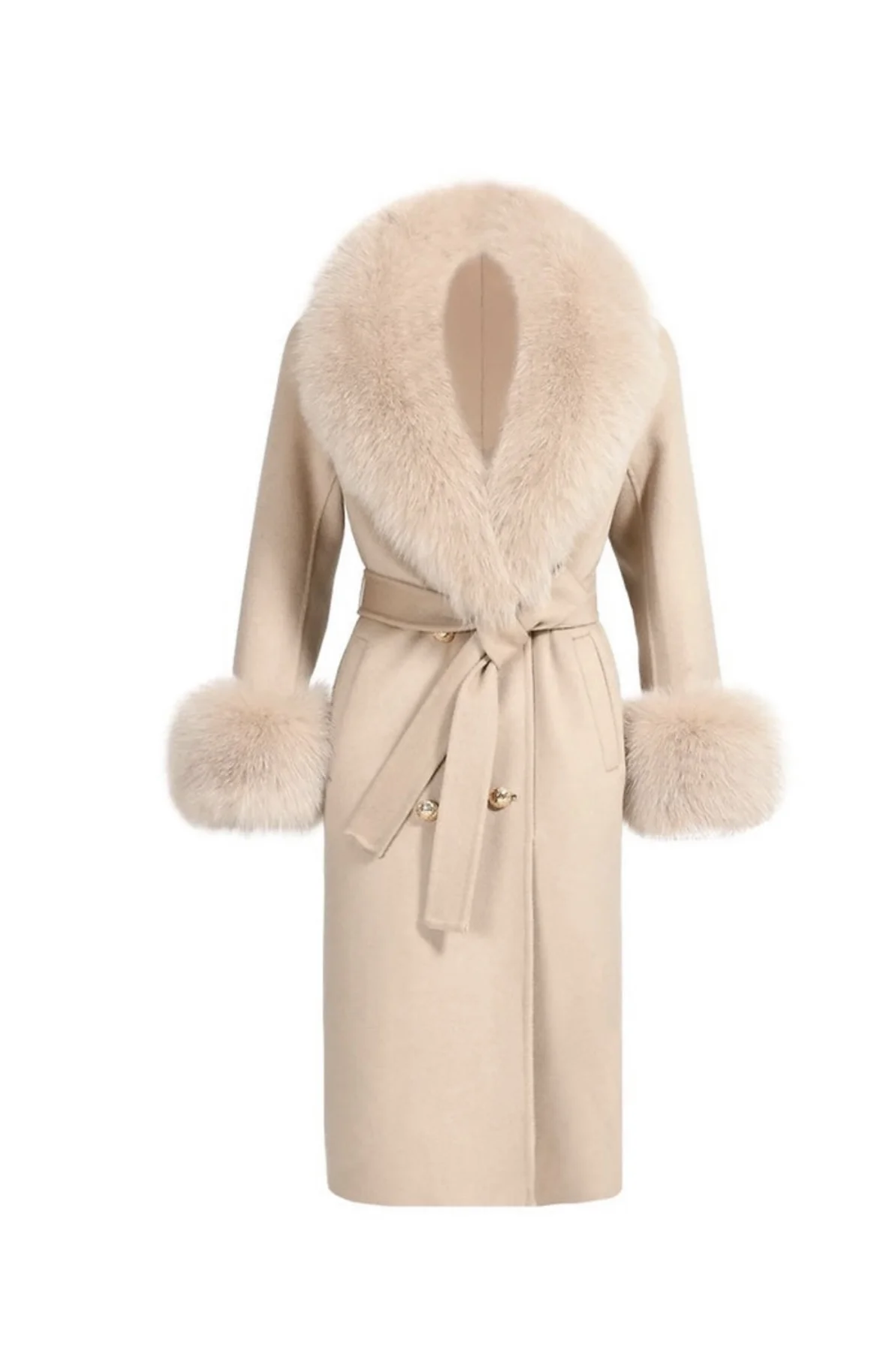 O sobretudo maxxi é projetado com o melhor e mais quente cashmere. Possui uma gola de pele de raposa densa, destacável e combinando com punhos de pele. Complementando os botões dourados e o cinto combinando para finalizar o visual.