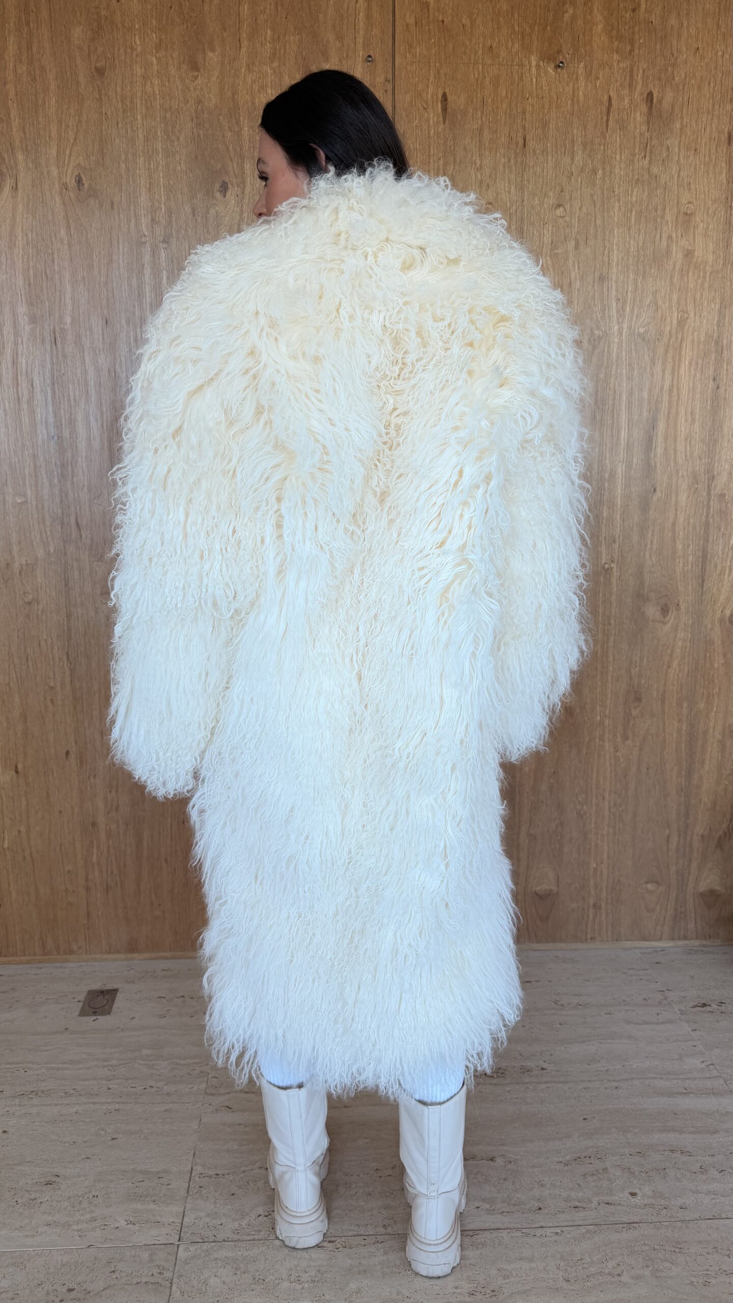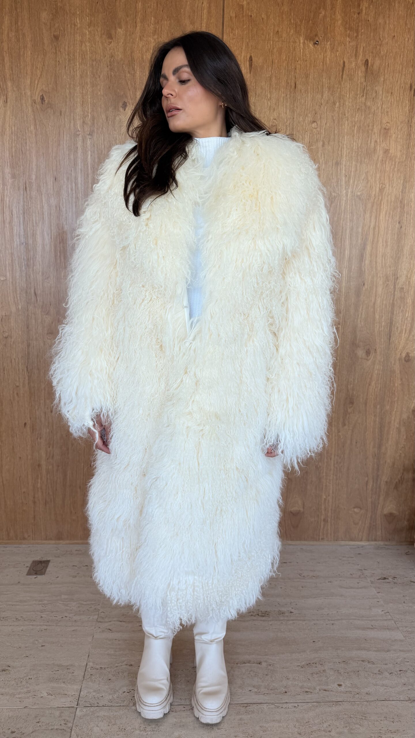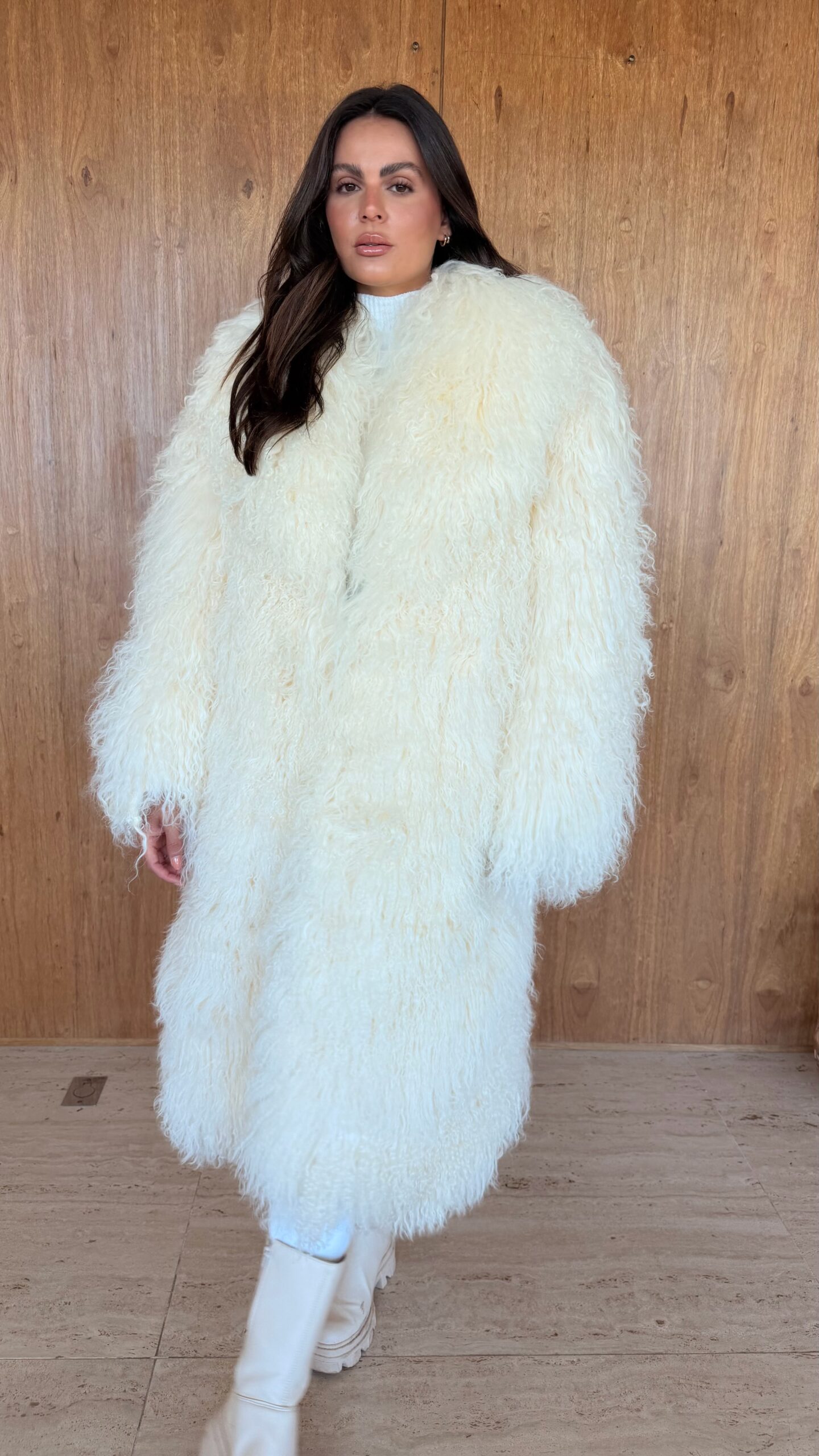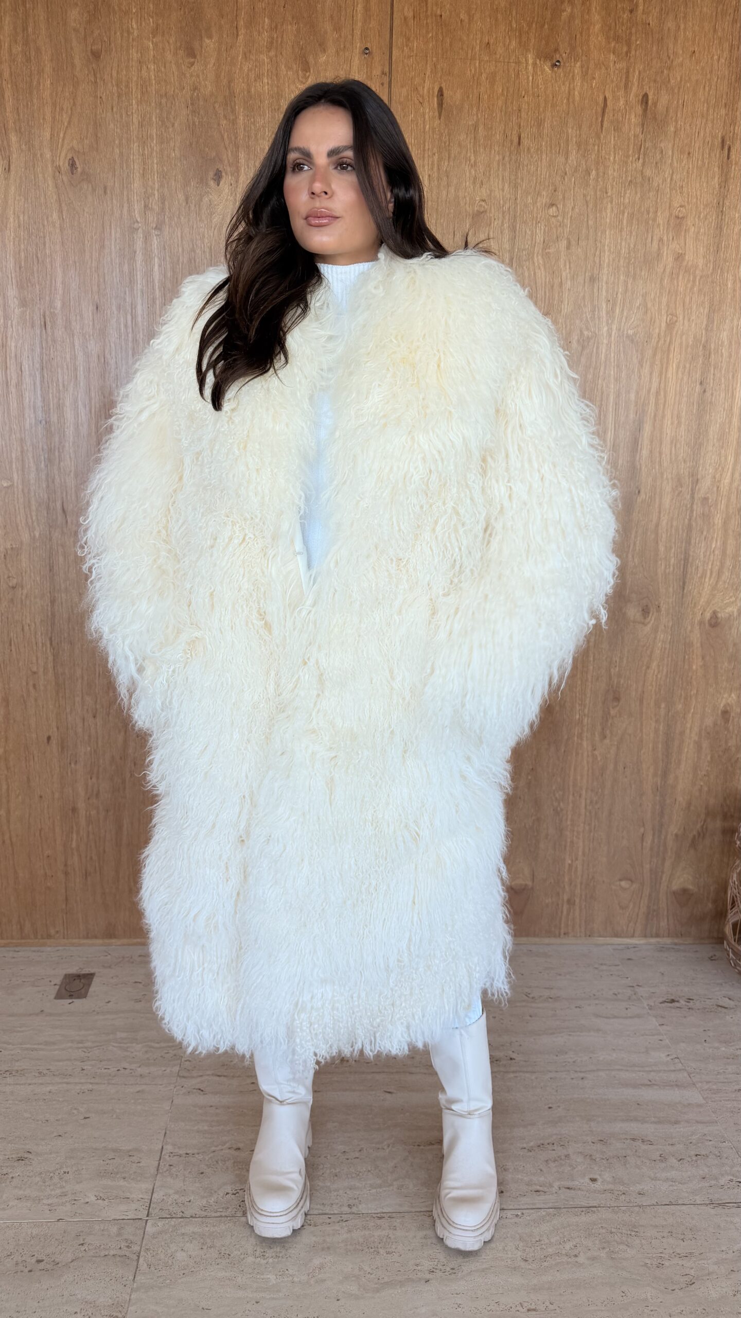 Casaco longo com pele de mongolian ultra macia, com visual sofisticado e moderno. A modelagem ampla traz conforto e elegância, perfeito para produções de inverno com um toque fashion statement.